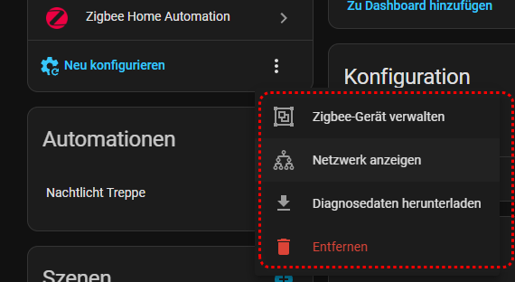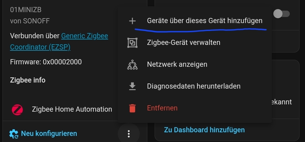 Bei ZHA kannst Du auch auswählen, über welches aktive Getät Du ein Neues anmelden möchtest. Bei „Neu konfigurieren“ rechts auf die 3 Punkte gehen und auswählen siehecBild.