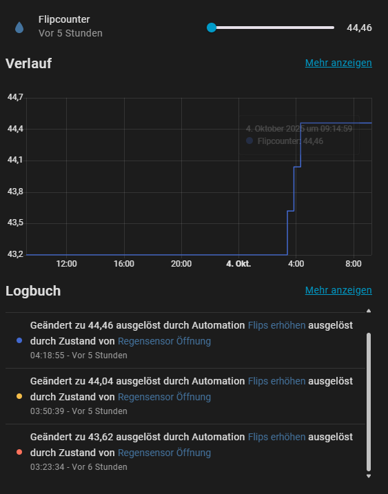 Wenn Du das ganze mit einem TRIGGER-BASED TEMPLATE SENSOR realisieren tust. Kannst Du dem Sensor auch die richtige state class (Langzeit Statistik) und eine device class ( precipitation) und Einheit mitgeben. Zusätzlich kannst Du dann diesen Sensor als Eingangs-Sensor für einen Verbrauchszähler verwenden. Also Stündlich/ Täglich / monatlich etc.