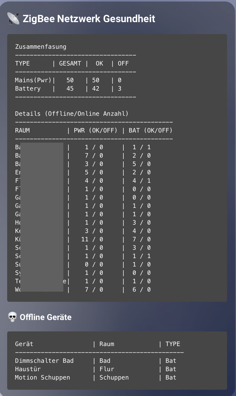 Eine erweiterte Darstellung. Alle ZigBee Geräte sortiert nach Räumen.